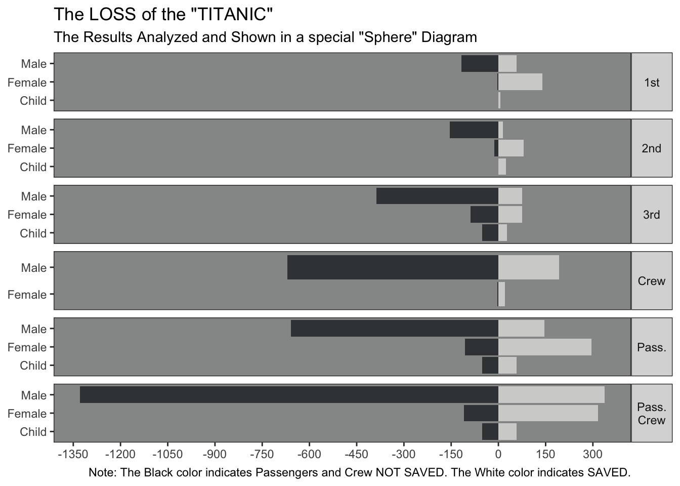 Looks nice. As you can see, the data cleaning was done in stages where 3 datasets t1, t2, t3 were built up. Essentially by staring at the plot it is clear that plots are split by class i.e. t1 data frame. However there are aggregate versions of these classes at combined Passenger level and Passenger and Crew level which are the t2 and t3 tibbles respectively. Finally we concatenate them together into ttnc_cln and ensure our categorical variables are cast as factors.